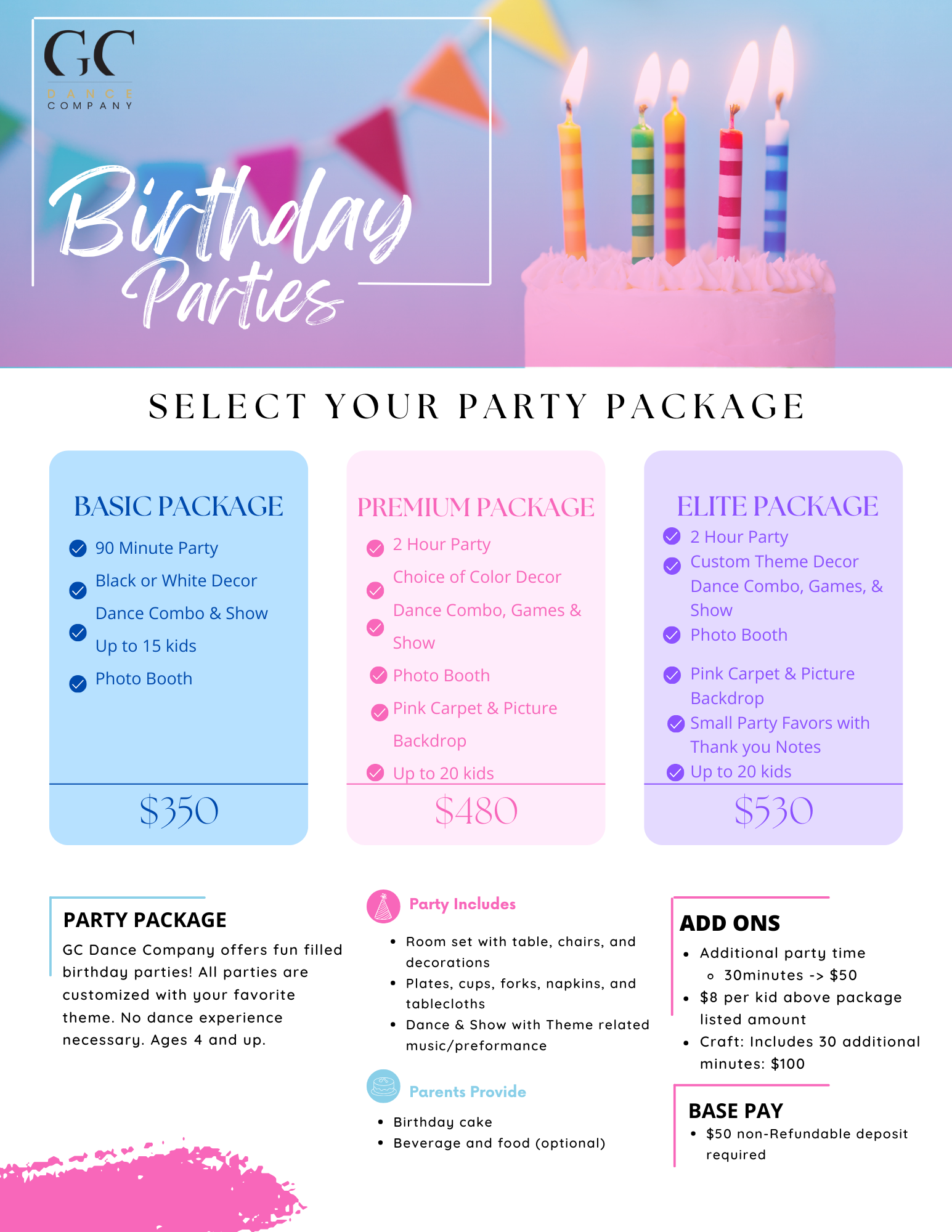 At GC Dance Company we're turning birthdays into a dance-filled party that's as unique as your little one. Our Dance Birthday Party is filled with fun, excitement and most importantly DANCE! Each party is personalized to the theme of your choice. Our main goal is to create a fun environment for your special one to create lasting memories. Let the celebration begin and book your Dance Birthday Party today!